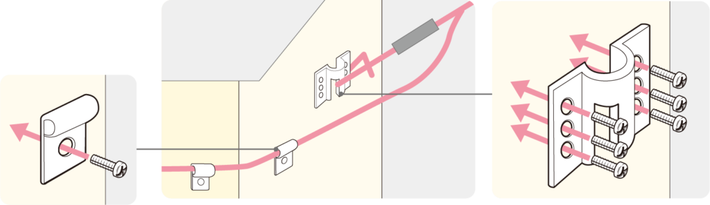 電線や電話線と同じように、壁面に穴あけしてビス等で固定します。