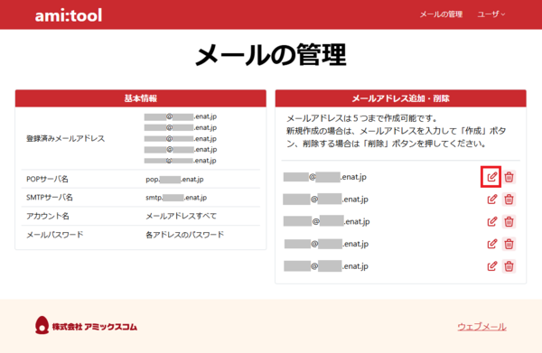 ami:toolメール(xxxx@xxxx.enat.jp)のパスワードは、お客様がお申し込みの際にご自身で決めていただいたパスワードになります。