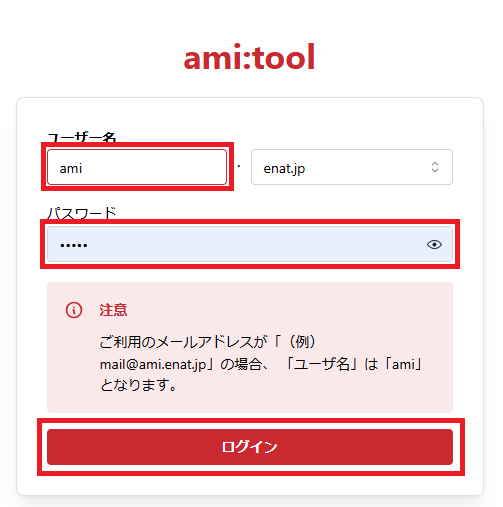 2.「ユーザー名」「パスワード」を入力した後、「ログイン」ボタンをクリックします ※「ユーザー名」は、メールアドレスの「@」より後ろの部分になります ※ここで入力求められる「パスワード」は、ami:tool新規お申し込み時、始めに決めていただいた「パスワード」です ※実際にメールの送受信でご利用されているメールアドレスの「パスワード」とは異なる場合があります