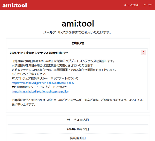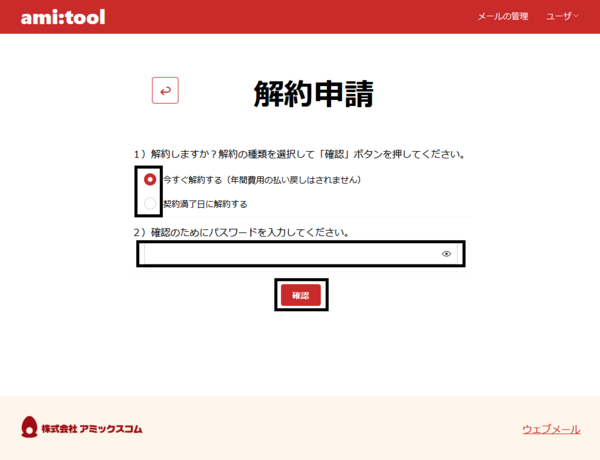 ※ami:toolを解約された場合、メールアドレス、サーバー上の電子メール及びホームページ領域は、全て削除される為二度と復元する事は、できません。