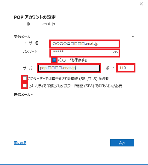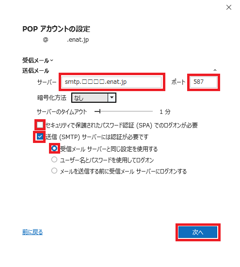 ・セキュリティで保護されたパスワード認証(SPA)でのログインが必要→□チェック不要