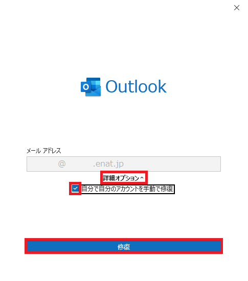 - 5.「詳細オプション」を選択した後「□自分で自分のアカウントを手動で修復」の頭に□にチェックを入れた後、「修復」ボタンをクリックします