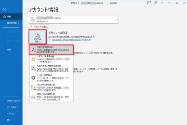 - 3.次に「アカウント設定」をクリックすると下側に表示されるメニューから「アカウント設定(A)」を選択します
