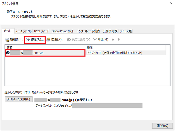- 4.表示された設定画面内にある「名前」の下のメールアドレス一覧から設定を見直したいメールアドレスを選択します。その後、メニューから「修復(R)」を選択します。