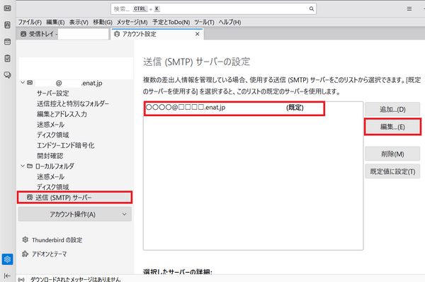 - 4.左側にある項目から「送信(SMTP)サーバー」を選択し確認したいメールアドレス(〇〇〇〇@□□□□.enat.jp)を選択した後「編集(E)」をクリックします