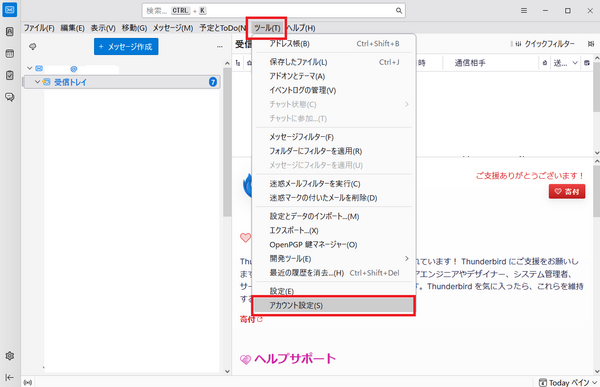 - 2.メニューから「ツール(T)」を選択した後、表示されるメニューの中から一番下の「アカウント設定(S)」を選択します