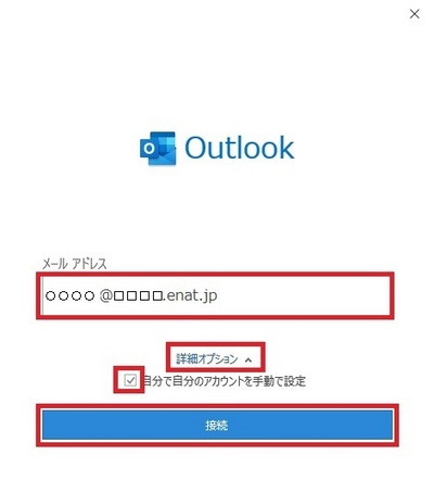 自分の「メールアドレス」を入力して「詳細オプション」を選択したのち「自分で自分のアカウントを手動設定」にチェックマークを入れてから「接続」ボタンをクリックします。