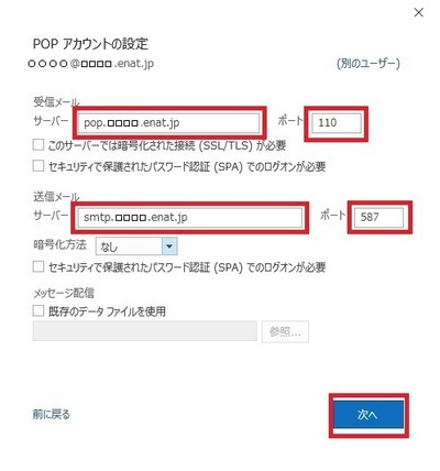 送信メールサーバーにサーバ名を入力します 例:smtp.□□□□.enat.jp