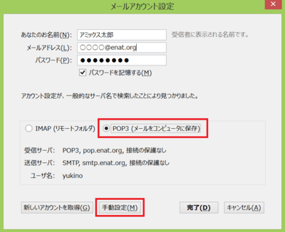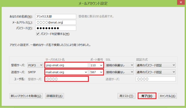 受信サーバ サーバのホスト名を入力します。 例:pop.enat.org