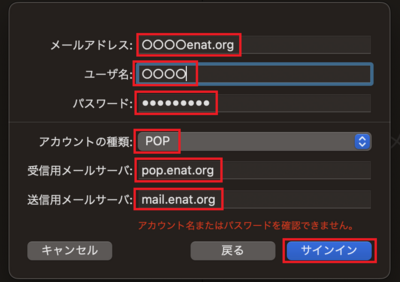 「アカウント名またはパスワードを確認できません。」と表示されるので以下の項目を確認、入力します。