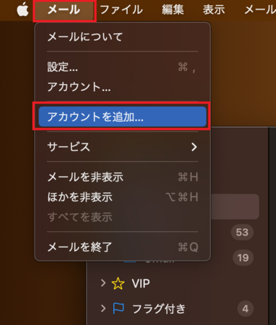 メニューから「メール」→「アカウントを追加…」を選択します。