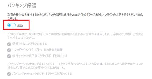 6.「無効」にした後に該当のページを開き情報が表示されるか確認をした後、バンキング保護を再び「有効」に戻す
