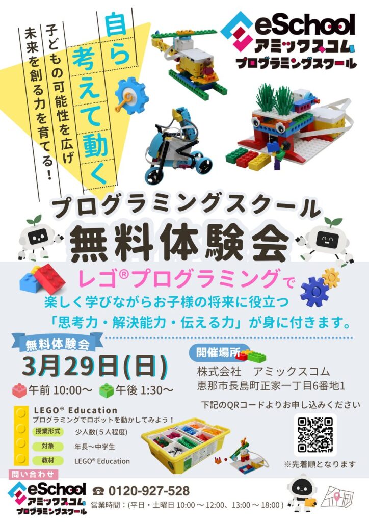 アミックスコムプログラミングスクールでは、子どもたちが大好きな「レゴブロック」を使って、楽しく論理的思考を育む無料体験会を開催します!