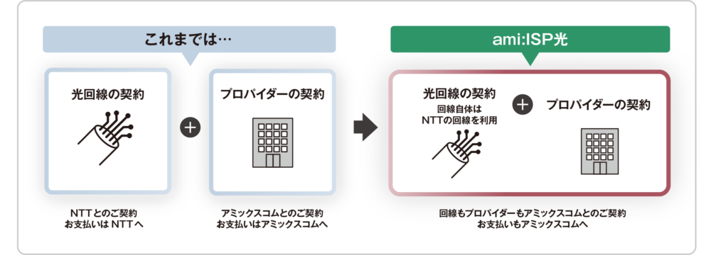 ※ami:ISP光でご契約を頂く場合、回線契約とプロバイダ契約はアミックスコム、オプションのご契約のみNTTで継続していただくことになります。