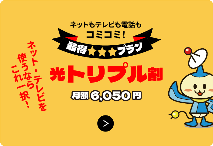 ※ケーブルライン(月額基本料金1,419円/月~)へのお申し込みが別途必要です。キャンペーン詳細は「おうち割 光セット(A) 提供条件書」をご確認ください。
